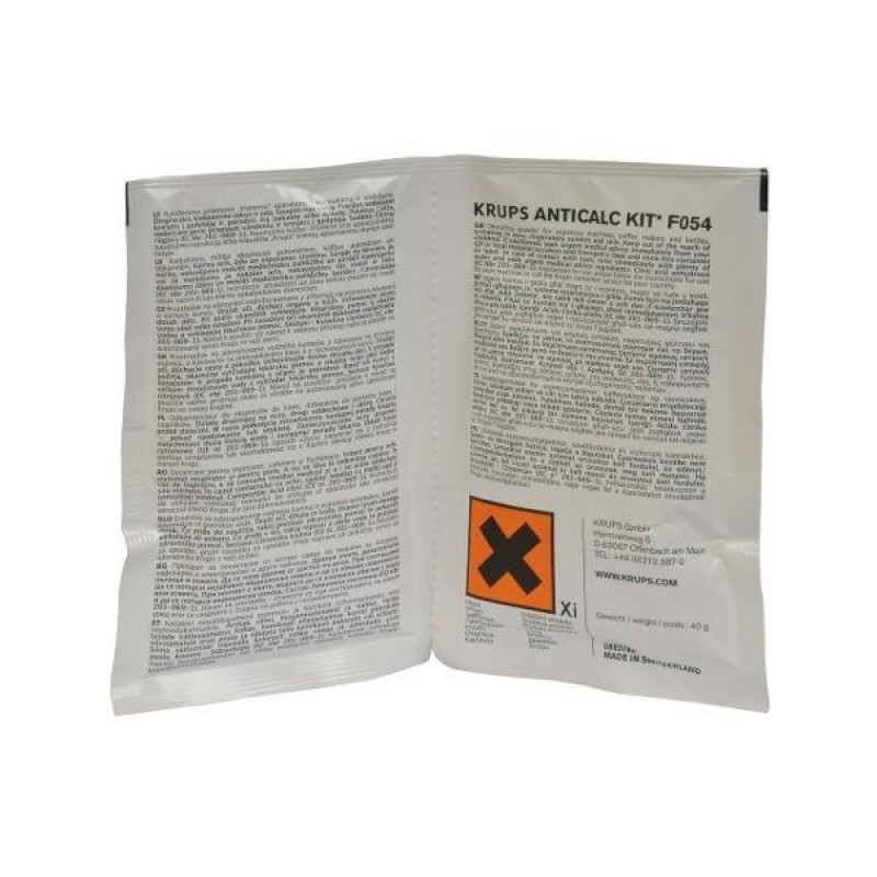 Set Krups F054001A pribor za čiščenje vodnega kamna. Navodila za uporabo: med postopkom odstranjevanja vodnega kamna, aparata ne izklapljajte. Stresite prašek v lonček z vodo in premešajte, nato vsebi..
