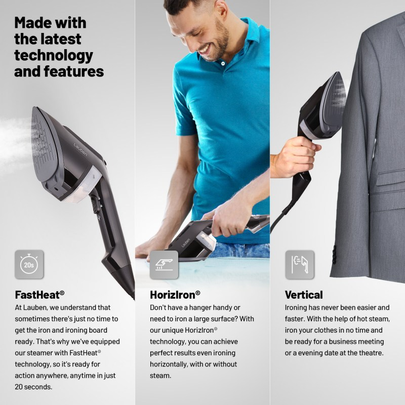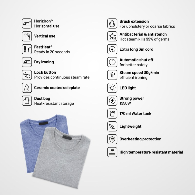 Ni časa, ki bi si ga lahko privoščili izgubiti, zato je za takojšno pripravo parnega likalnika na delovanje tukaj tehnologija FastHeat®. Z njeno pomočjo je naprava pripravljena na delo v 20 sekundah od vklopa, ne glede na to, kje ste. Včasih ni pri roki niti obešalnika, ali pa je površina tako velika, da klasično likanje odpade. Tu na vrsto pride tehnologija HorizIron®, s katero boste dosegli popolne rezultate tudi s horizontalnim parnim likanjem ali s suhim likanjem.
