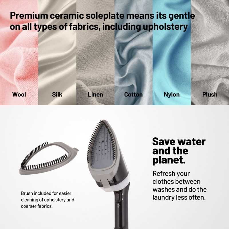 Ta parni likalnik kombinira zmogljivost likalnika z močjo pare, da v trenutku zlika pregibe na oblačilih in oblazinjenem pohištvu in hkrati uniči 99,9 odstotkov bakterij. Poživi in odstrani prah tudi z nekaj dni nošenih oblačil, ki jih zato ni treba prati tako pogosto. Vse to s pomočjo čiste vode, brez kemikalij.