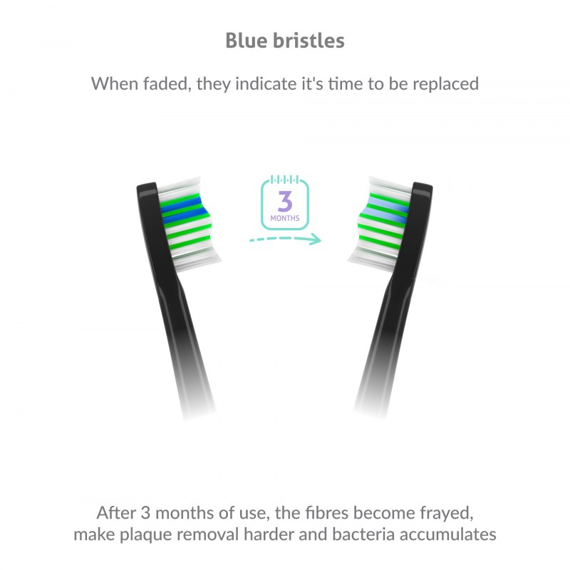 Glava zdrži približno tri mesece uporabe, potem pa se začne cefrati, izgublja na učinkovitosti, poleg tega pa se na njej kopičijo bakterije. Na srečo so glave opremljene z modrimi ščetinami, ki po treh mesecih zbledijo in vi takoj veste, da je potrebno zamenjati glavo.