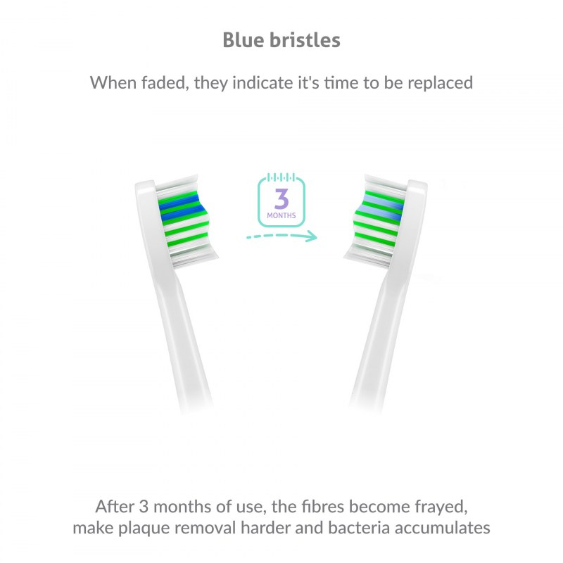 Glava zdrži približno tri mesece uporabe, potem pa se začne cefrati, izgublja na učinkovitosti, poleg tega pa se na njej kopičijo bakterije. Na srečo so glave opremljene z modrimi ščetinami, ki po treh mesecih zbledijo in vi takoj veste, da je potrebno zamenjati glavo.