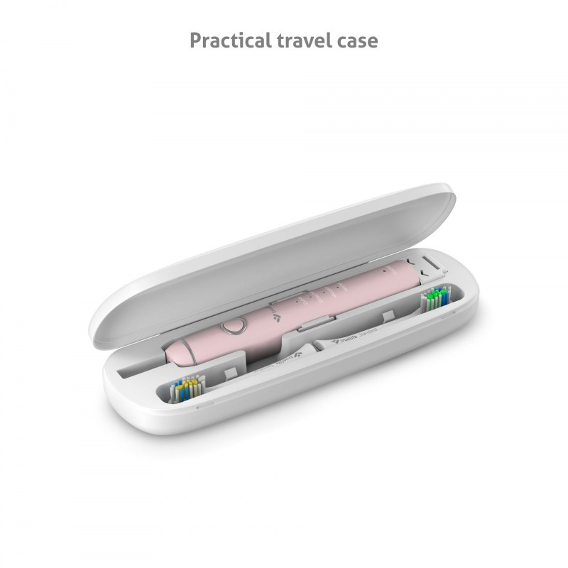 SonicBrush Compact Pink gre zahvaljujoč svoji majhnosti v vsako torbico. Prvorazredno zobno higieno si lahko tako privoščite tudi na potovanjih. Polnilno stojalo lahko ostane doma. Baterija v ščetki zdrži do 30 dni čiščenja. Minimalistični dizajn bo poživil vašo kopalnico, ena sama tipka pa zagotavlja enostavno upravljanje.