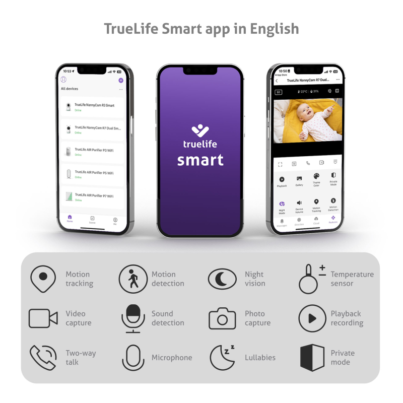 Elektronsko varuško TrueLife NannyCam R7 Dual Smart preprosto seznanite s svojim telefonom ali drugo pametno napravo s pomočjo aplikacije TrueLife Smart, ki je na voljo v več jezikih. Račun je mogoče deliti tudi z drugimi, na primer s partnerjem ali starimi starši, število udeležencev ni omejeno. Aplikacija TrueLife Smart obenem uporablja petnivojsko varnostno tehnologijo s šifriranjem podatkov na vojaški ravni AES, s pomočjo katere se vam ni treba bati kakršnihkoli zunanjih motenj. Vaš malček bo ostal na varnem. Zakaj taka zaščita? Vendarle varujemo vaš največji zaklad.