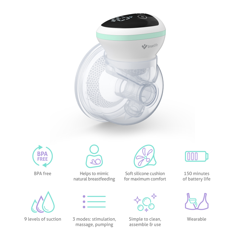 Električna črpalka za mleko TrueLife Nutrio BP W5 prinaša večje udobje materam in dojenčkom. Njeni 3 načini zagotavljajo stimulacijo mlečne žleze za podporo laktaciji in pretoku mleka, masažo, ki sprosti dojke in sesanje materinega mleka v ritmu, ki posnema sesanje dojenčka. Vsak od načinov ponuja 9 stopenj intenzivnosti. Če imate težave s proizvodnjo mleka, lahko prsna črpalka pomaga pri dojenju. Ekstrakcija poteka samodejno zahvaljujoč električni črpalki. Naprava je enodelni kos z baterijskim napajanjem, ki ga lahko udobno nosite s seboj na potovanjih. Možen je tudi nakup posebnega nedrčka TrueLife Nutrio Bra, v katerega preprosto vstavite prsno črpalko in imate proste roke. Ergonomska oblika prsne črpalke iz mehkega silikona in plastike brez BPA se popolnoma prilega dojki, mleko teče v 210 ml posodico in jo lahko shranite za kasneje. Pregleden LED zaslon prikazuje trenutno izbrani način in časovnik, vse lahko enostavno nastavite tudi z gumbi.