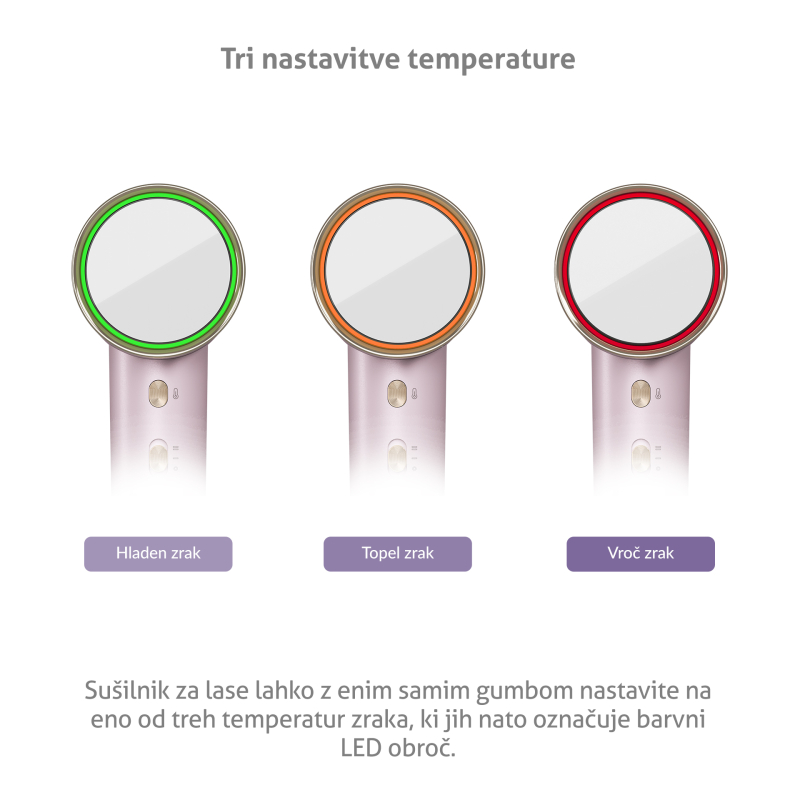 S pomočjo enega samega gumba enostavno izberete temperaturo, pri kateri želite sušiti lase. Izbirate lahko med hladnim, toplim, toplim zrakom in načinom izmenjevanja hladnega in toplega zraka. Izbirate lahko med visoko in normalno hitrostjo sušenja.