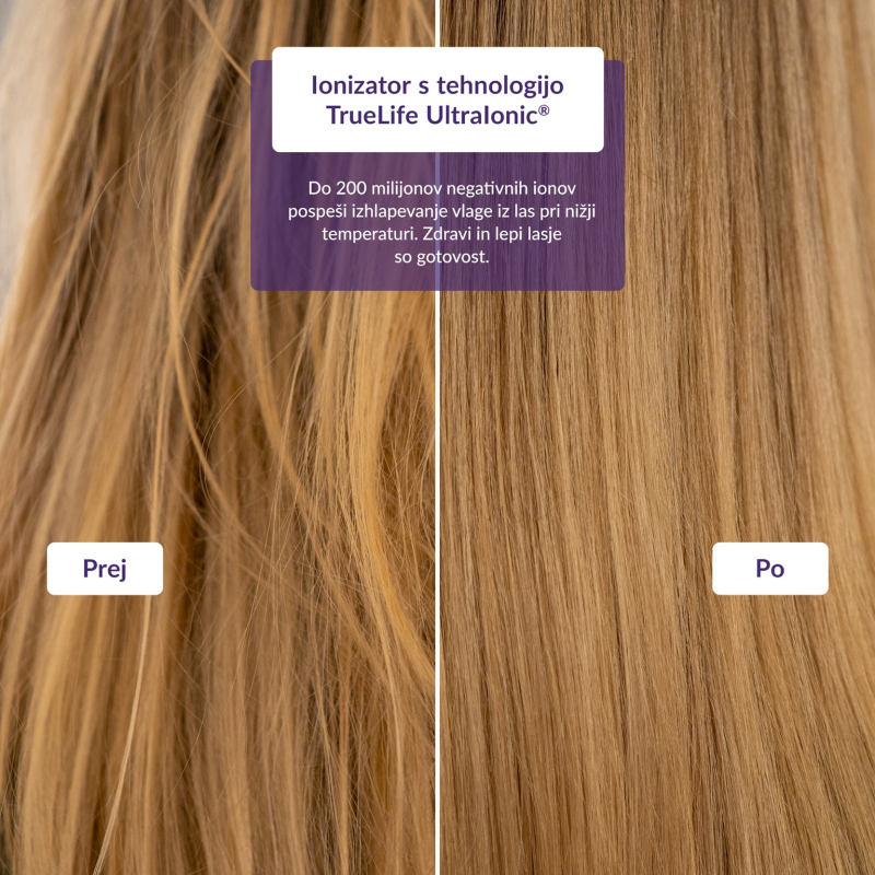 Zagotovite svojim lasem najboljšo nego, sušilnik za lase z ionizatorjem TrueLife HairDryer D6 jih bo profesionalno obdelal v udobju vašega doma. Njegov super hiter motor s tehnologijo TrueLife UltraFlow® se ponaša z močjo do 110.000 vrtljajev na minuto. Ionizator s tehnologijo TrueLife UltraIonic® ustvari okoli 200 milijonov negativnih ionov, ki pripomorejo k bolj gladkim in zdravim lasem, saj je sušenje nežnejše in hitrejše. Trenutno izbrano temperaturo označuje barvni LED obroček, izbirate pa lahko med 3 stopinjami ali načinom za izmenjevanje hladnega in toplega zraka, izbirate pa lahko tudi med 2 hitrostma sušenja. Popoln stajling bo podprl priložen magnetni nastavek za koncentracijo. Konec presuhih in poškodovanih las zahvaljujoč tehnologiji TrueLife ConstantHeat® temperatura med sušenjem ne niha. Sušilnik za lase deluje zelo tiho, za varnost skrbi zaščita pred pregrevanjem in vam ni treba skrbeti niti za vzdrževanje, odstranljiv filter za prah je enostavno odviti in očistiti.