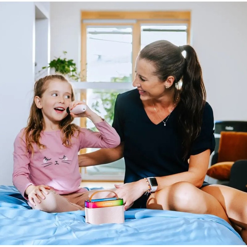 Otroci se ne bojijo dati vse od sebe, celo začeti pravo glasbeno predstavo. Pri tem jim bo spretno pomagal zvočnik LAMAX KaraokeKid1 v hladno modri ali roza otroški izvedbi, ki ima prav tako dovršen karaoke mikrofon. Seveda lahko zvočnik uporabite tudi za poslušanje pravljic ali glasbe, a otroci se bodo z njim res odlično zabavali, še posebej med karaokami na otroških zabavah ali pri vadbi svojih pevskih nastopov. Način za karaoke lahko odstrani vokale in ustvari karaoke različico vsake pesmi. Z mikrofonom, ki lahko spremeni glas, se lahko celo odrasli izognejo. Kdo ne želi zveneti demonsko ali kot Smrkec? Pravo vzdušje dopolnjuje barvna LED osvetlitev ozadja. Zvočnik lahko preprosto povežete z različnimi napravami preko sodobnega Bluetooth 5.3. Ta prenosni pomočnik bo vsakega malčka spremenil v glasbeno zvezdo najvišjega razreda.