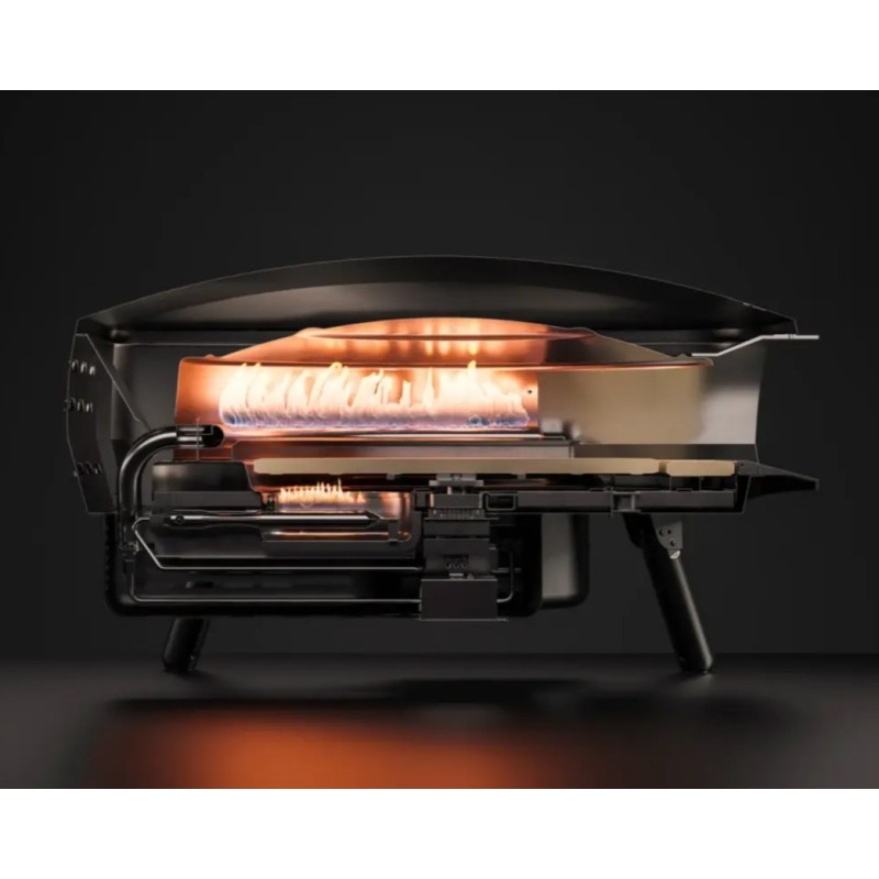 Booster gorilnik pod kamnom stabilizira temperaturo med zaporednimi pekačami, medtem ko U-oblikovan glavni gorilnik zagotavlja enakomerno toploto okoli celotne pice.