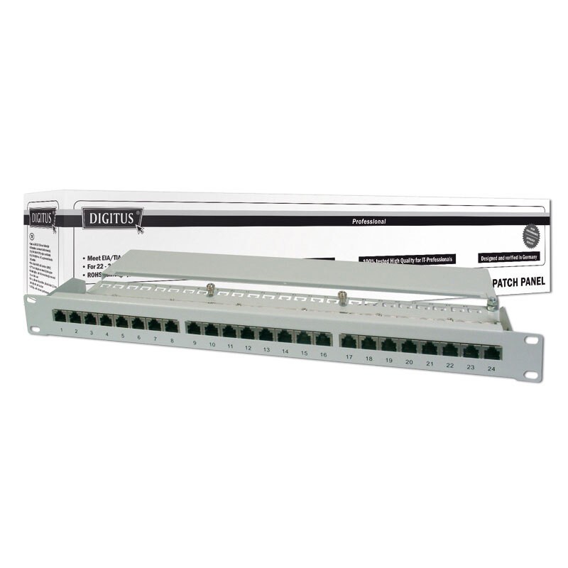 Digitus CAT 5e Patch Panel razred D, Oklopljen, 24-Port RJ45, 8P8C, LSA, 1U, rack mount barva siva RAL 7035 Tehnični podatki: • Izdelano v skladu. zahteve glede zmogljivosti povezav razreda E do 250 ..