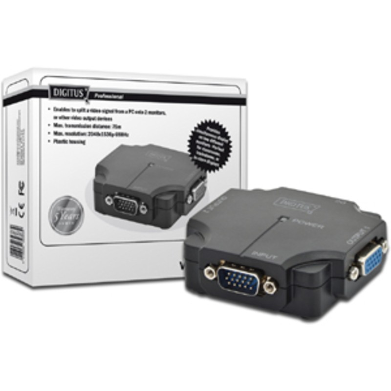 DIGITUS Video delilnik 1 PC, 2 monitorja, 350 MHz, HDSUB 15 moški 2x 15 ženski HDSUB, največja ločljivost 2048x1536 pik Z video delilnikom je možno prikazati sliko iz video izvora na 2, 4, 8, 16 al..