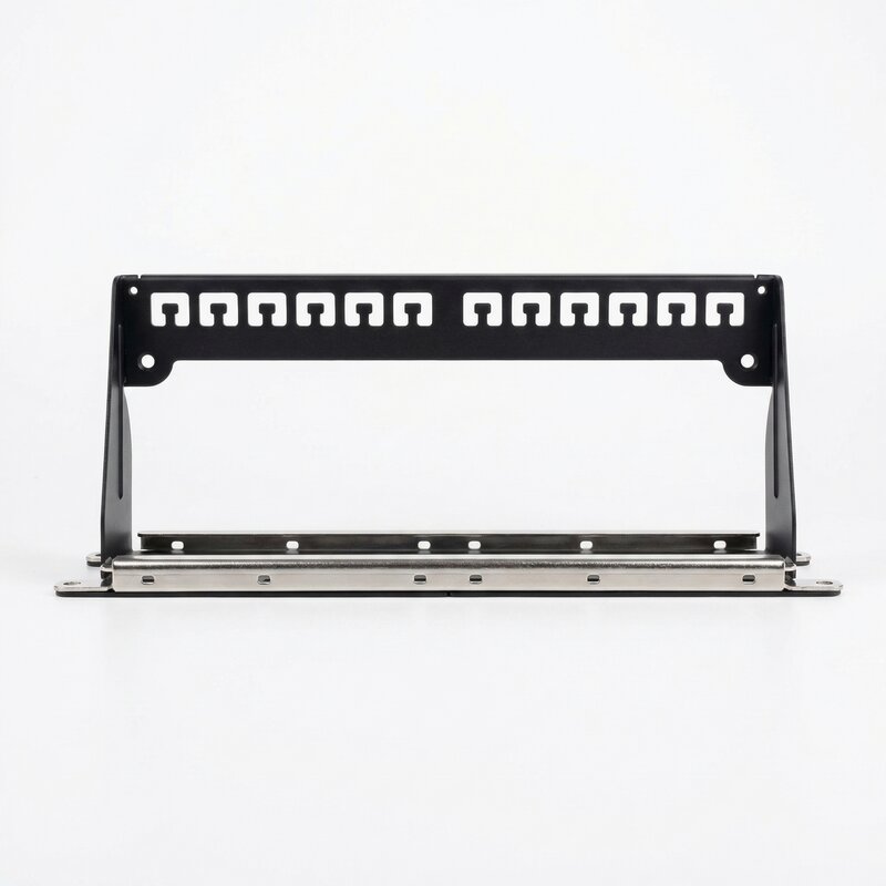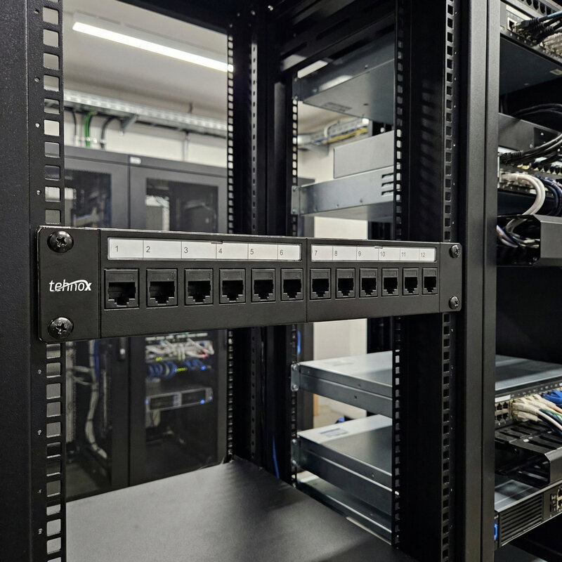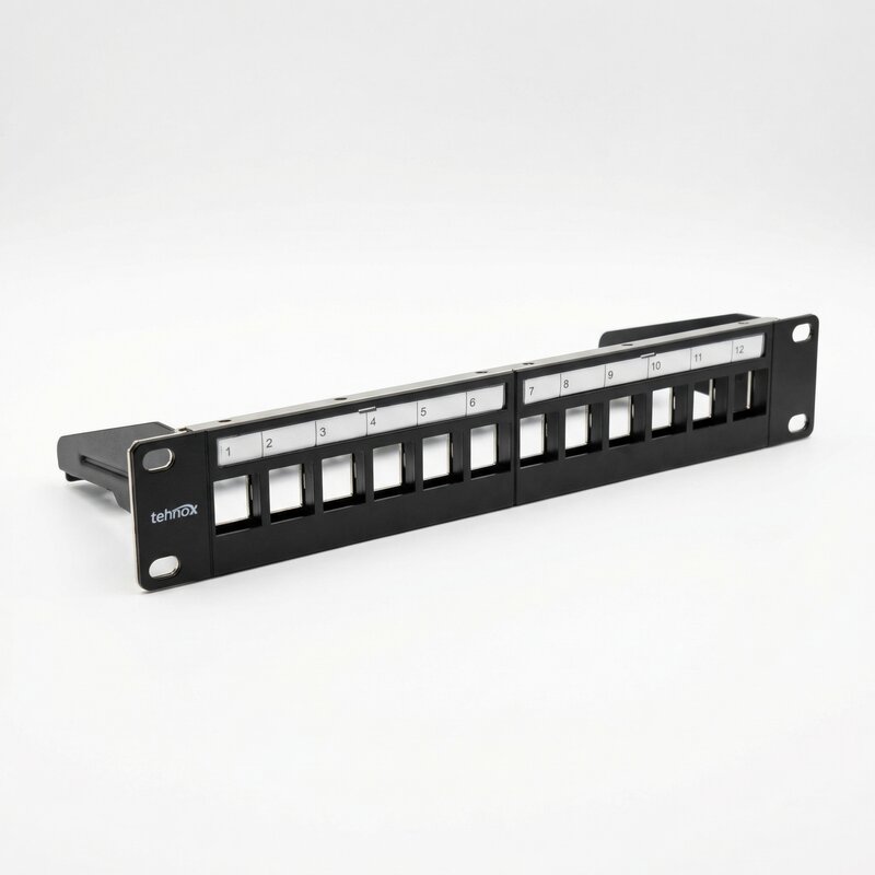 Modularni distribucijski ( Patch ) Panel, Oklopljen, 12-Port, prazen, 1U, 10¨ barva črna RAL 9005 Tehnične podrobnosti: • Patch Panel za Keystone Module • Material ohišja: SPCC 1,5 mm hladno valjan..